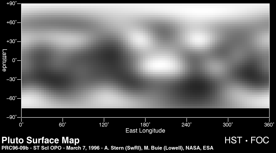 Mapa, ktera pokryva 85% povrchu planety potvrzuje, ze Pluto ma tmavy rovnikovy pas a jasne polarni cepicky. To bylo predpovidano jiz podle pozemskych pozorovani, podle svetelnych krivek ziskanych behem vzajemnych zakrytu Pluta a jeho mesice Charona koncem roku 1980.